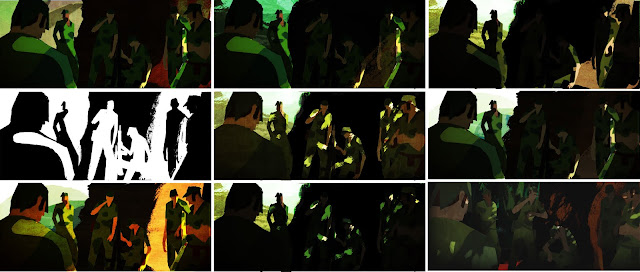 Since this character would only appear in 5 different shots in the movie, we decided to move on with the graphic development of the character straight on top of the scenarios, with the planned framings.