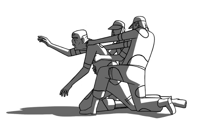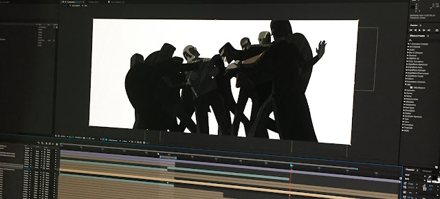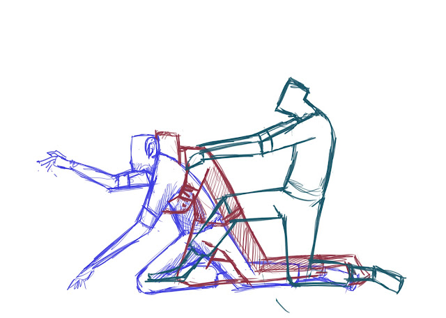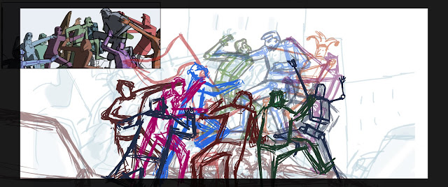After finding the key characters' position for this action, I started by placing the secondary ones, taking into account the composition of how the final shot should end up.