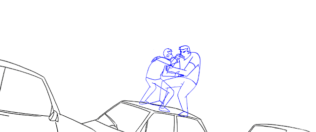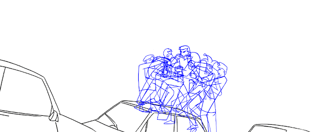 José Miguel intended with this shot to show the different characters evolving to a single living mass, breathing heavily, with the city in the background. Taking into account the continuity with the previous shot, 22, in which all the characters begin to climb up the cars, I initiated the cars' layout design, by placing Mário and the 'front line driver' on top of the image, slightly decentered.